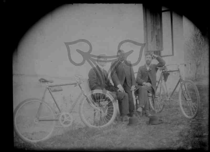 Vor einer hellen Gebäudewand sitzen im Freien auf Stühlen nebeneinander drei dunkel gekleidete Männer. Vor ihnen liegen zwei schwarze Hüte im Gras. Links und rechts von ihnen stehen zwei Fahrräder.