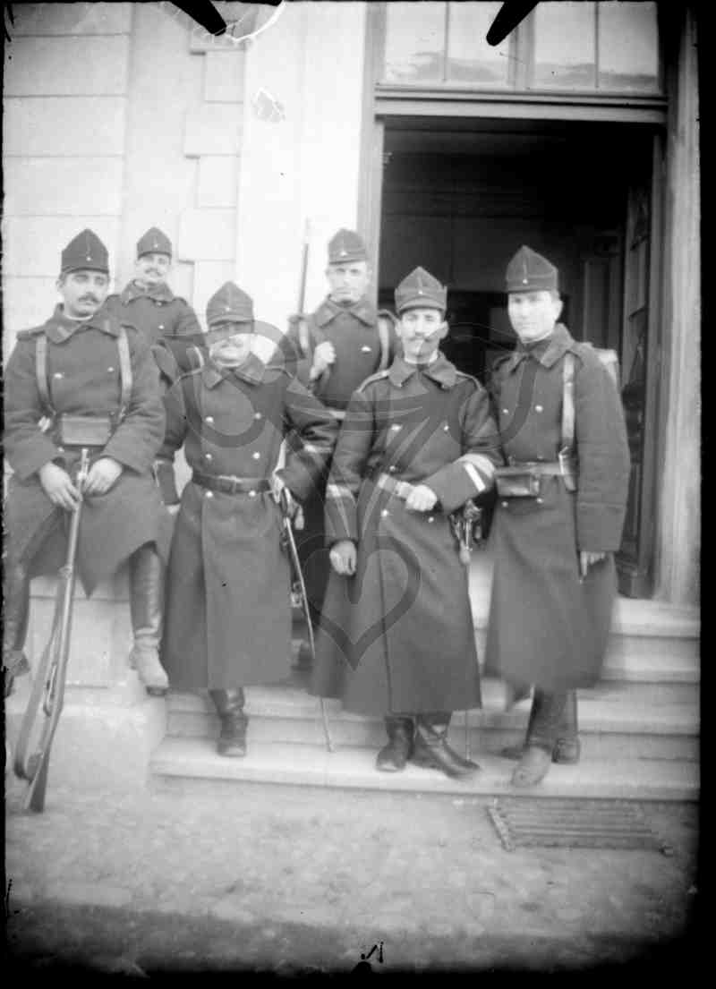 Auf den Treppen eines Hauseinganges stehen hintereinander in zwei lockeren Reihen sechs Soldaten. Sie sind mit dunklen Mänteln und Schiffchen bekleidet und führen entweder ein Gewehr oder einen Degen mit sich.