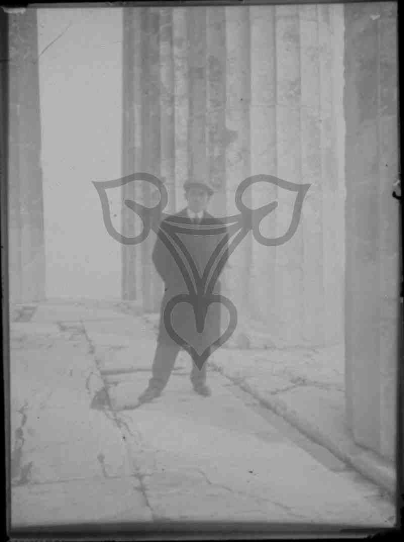 Der Mann steht vermutlich im Parthenon-Tempel auf der Akropolis in Athen, trägt eine graue Hose, einen schwarzen Mantel und eine graue Baskenmütze und blickt in die Kamera.