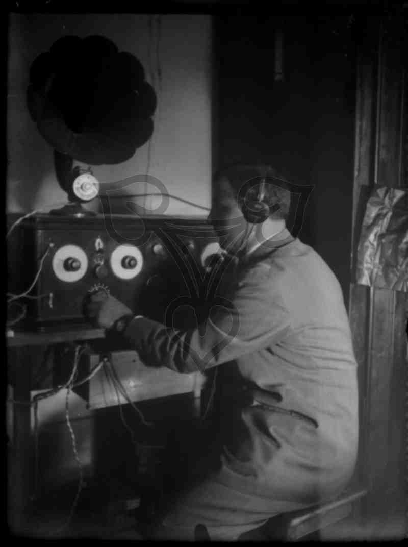 Der Mann sitzt nach links gewandt vor einem Funkgerät und bedient mit der rechten Hand einen Regler. Gekleidet ist er in einen grauen oder dunklen Nadelstreifenanzug, auf den Ohren sitzen Kopfhörer. Auf dem Gerät steht ein Schalltrichter. Porträt s. PB 207/17.
