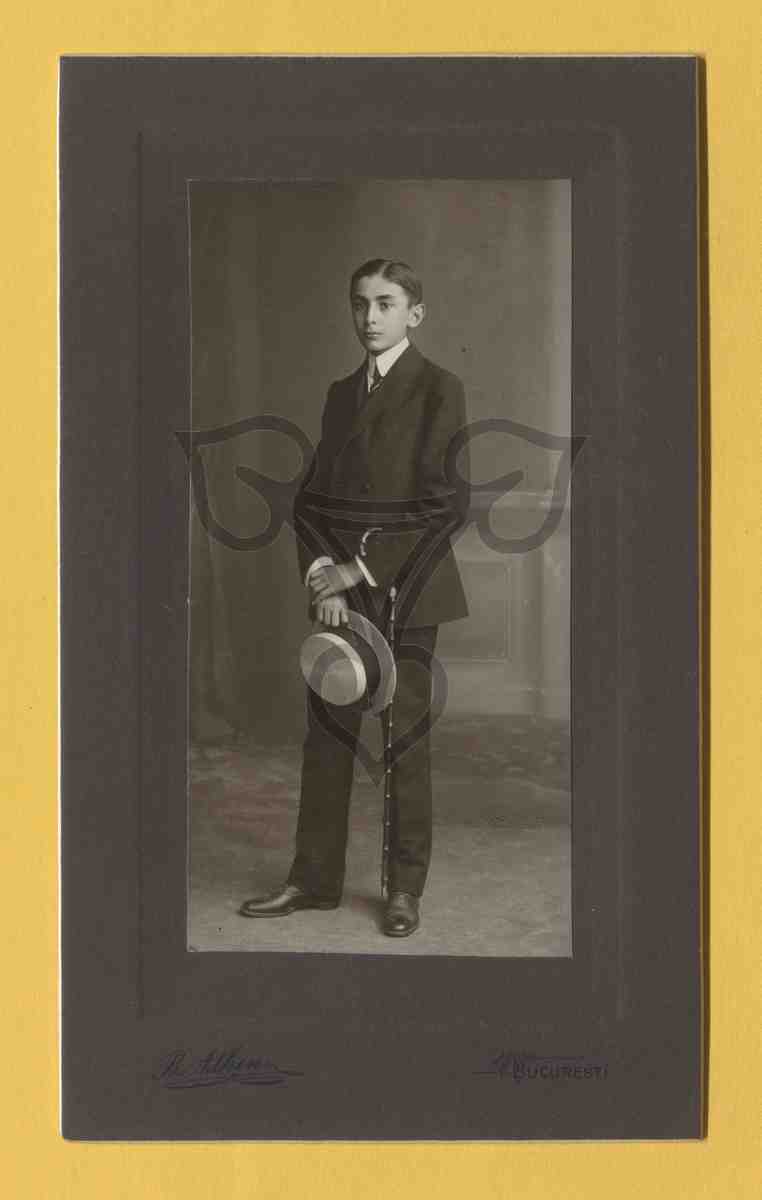 Studioaufnahme, gemalter Hintergrund. Aufrecht stehender Junge in schwarzem Anzug mit Gehstock und Strohhut in der Hand.