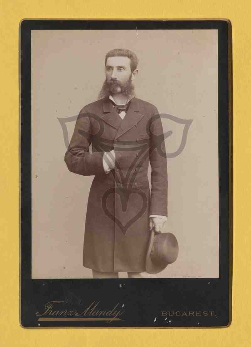 Studioaufnahme, gemalter Hintergrund. Der aufrecht stehende Mann ist in einen dunklen Mantel gekleidet, hat die rechte Hand unter die Knopfleiste geschoben, hält in der linken einen schwarzen Hut und blickt nach links.