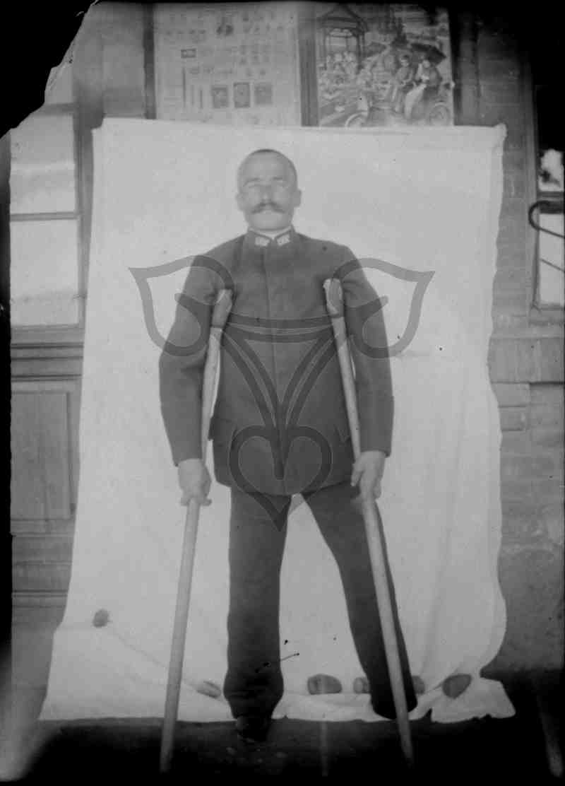Der unbekannte Mann steht auf zwei Krücken vor einem weißen Laken, dass an der Außenseite einer Hauswand befestigt worden ist.