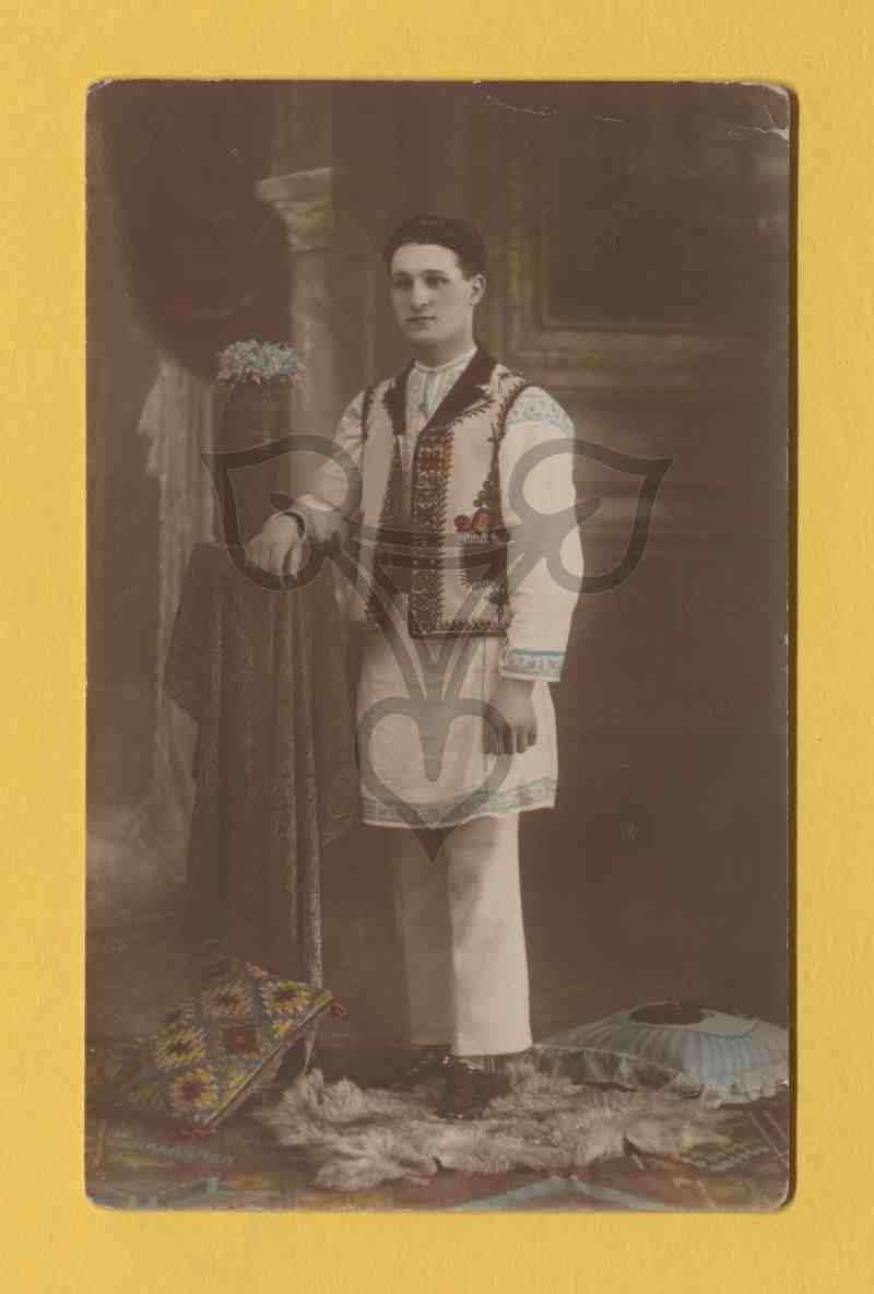 Studioaufnahme, gemalter Hintergrund. Der Tracht tragenden Mann steht aufrecht nach links gewandt und blickt an der Kamera vorbei. Sein linker Unterarm ist auf einem mit einem schwarzen Tuch verdecktem Blumenständer aufgelegt.