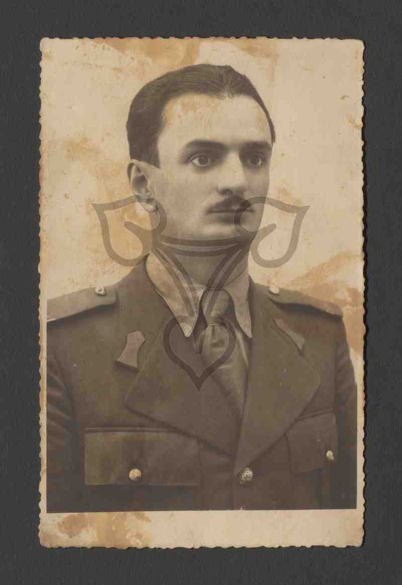 Halbbrustporträt. Ein Mann in rumänischer Uniform des Zweiten Weltkrieges steht vor einem neutralen Hintergrund und blickt rechts an der Kamera vorbei.