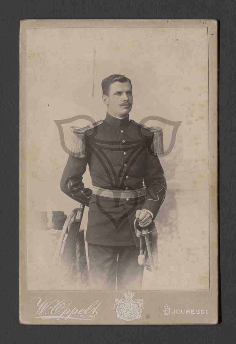 Studioaufnahme, neutraler Hintergrund. Aufrecht stehender Soldat.