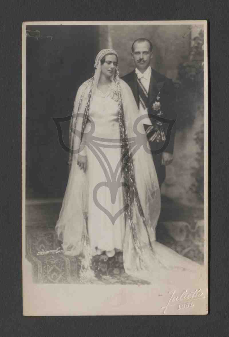 Das Brautpaar, die Frau links in weißem Kleid, der Mann rechts dahinter im Frack mit weißem Hemd, weißer Fliege, einer Schärpe unter der Jacke sowie mehrere Orden auf der Brust, steht auf einer mit einem Teppich ausgelegten Treppenaufgang vor dem Portal eines nicht näher bestimmbaren Gebäudes. Der Mann blickt in die Kamera, die Frau rechts unten. In der rechten unteren Ecke der Prägestempel des Fotografen.