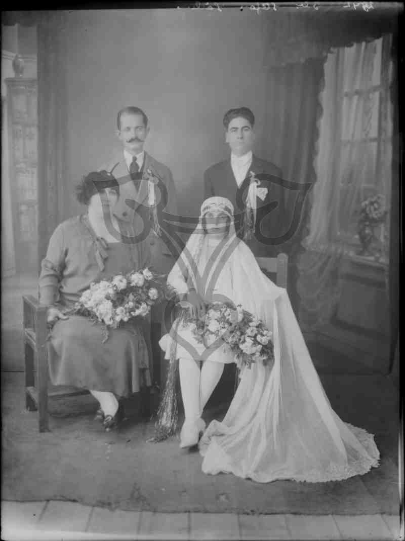 Studioaufnahme, gemalter Hintergrund. Auf einem ausgelegten löcherigen und ausgefranztem Teppich sitzen zwei Frauen, die rechte eine Braut, auf zwei Stühlen. Dahinter stehen zwei Männer, der Rechte der Bräutigam. Beide Frauen halten Blumensträuße auf dem Schoß.