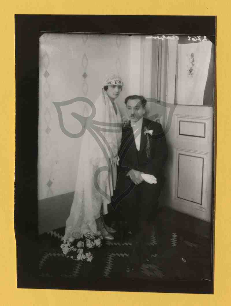 In der Ecke eines Zimmers mit bunt gemusterten weißen Wänden sitzt der Mann auf einem Stuhl, die Frau steht ihm zugewandt rechts neben ihm, hat ihre rechte Hand auf seine linke Schulter gelegt, und blickt links an der Kamera vorbei. Der Mann trägt einen schwarzen Anzug mit weißem Hemd und Fliege und hält in den im Schoß gefalteten Händen ein Paar weiße Handschuhe. Vgl. auch PB 207/153 und PB 207/155.