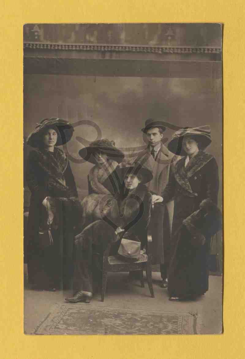 Studioaufnahme, gemalter Hintergrund. Um eine in einem Stuhl sitzende Frau sind drei weitere Frauen und ein Mann gruppiert. Die Frauen sind alle in schwarze Mäntel mit Hüten bekleidet, der Mann trägt einen grauen Mantel und einen schwarzen Hut. Alle blicken in die Kamera.