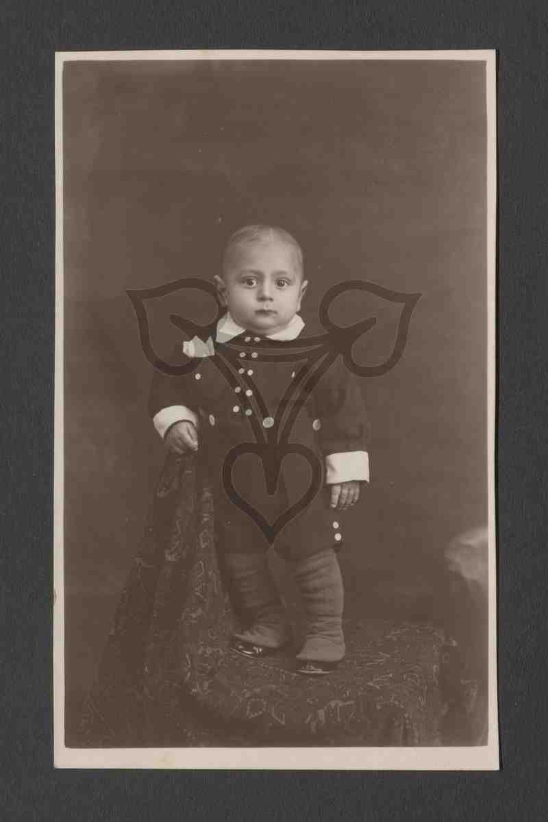 Studioaufnahme, neutraler Hintergrund. Der einjährige Junge steht auf einem mit einer stark gemusterten Decke (oder einem Teppich) bedecktem Stuhl, trägt einen dunklen übergroßen Marineanzug, stützt sich mit dem rechten Arm an der Stuhllehne ab, ist nach links gewandt und blickt in die Kamera.