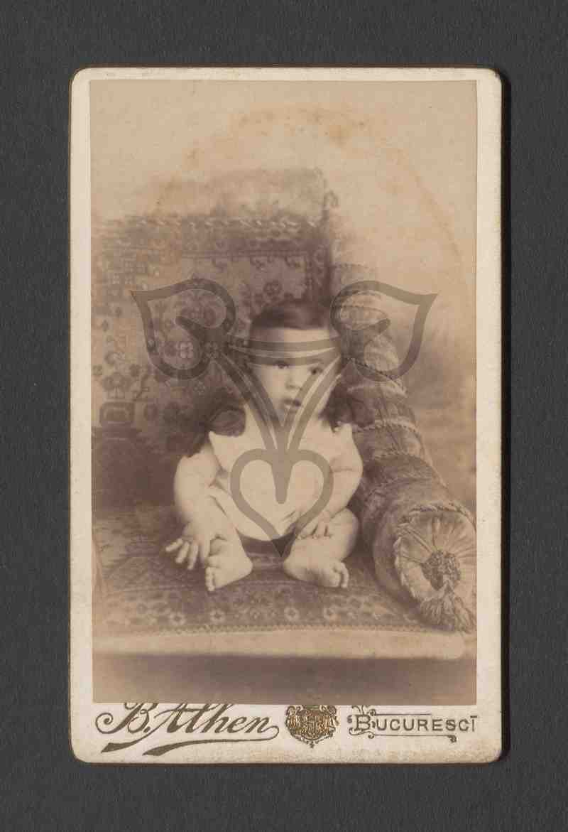 Studioaufnahme, neutraler Hintergrund, Sofa Requisite. Ein Kleinkind, vermutlich ein Junge, sitzt mit offenem Mund auf einem Sofa und blickt rechts an der Kamera vorbei.