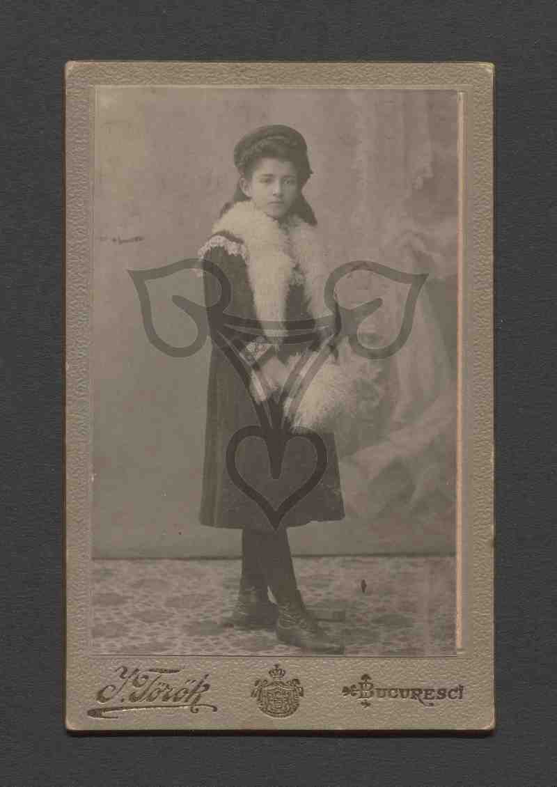 Studioaufnahme, gemalter Hintergrund. Das Mädchen steht aufrecht nach rechts gewandt auf einem Teppich, trägt schwarze Schuhe uns Stümpfe, einen schwarzen Hut und ein schwarzes Kleid mit breitem, weiß umrandeten Kragen. Auf den Schultern liegt eine weiße Fellstola, die Hände sind in einem weißen Fellmuff gesteckt.