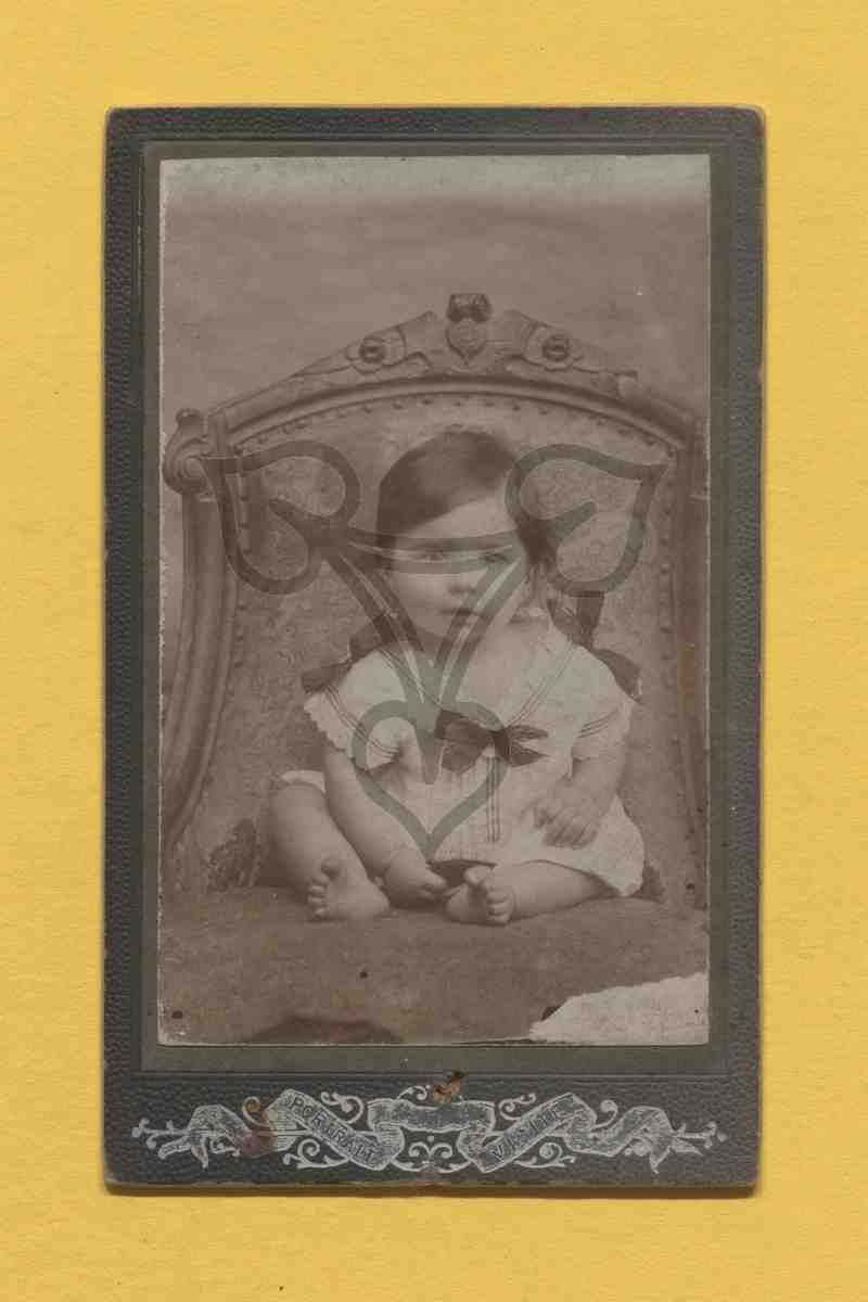 Studioaufnahme, neutraler Hintergrund. Das Mädchen ist mit einem weißen Kleidchen bekleidet, barfuß, sitzt in einem Sessel, an dessen Rückenlehne es sich lehnt, und blickt in die Kamera.