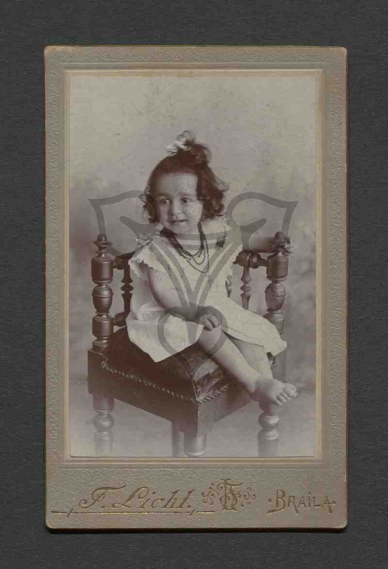 Studioaufnahme, neutraler Hintergrund. Das Kind sitzt auf einem Stuhl, ist nach rechts gewandt und blickt links an der Kamera vorbei.
