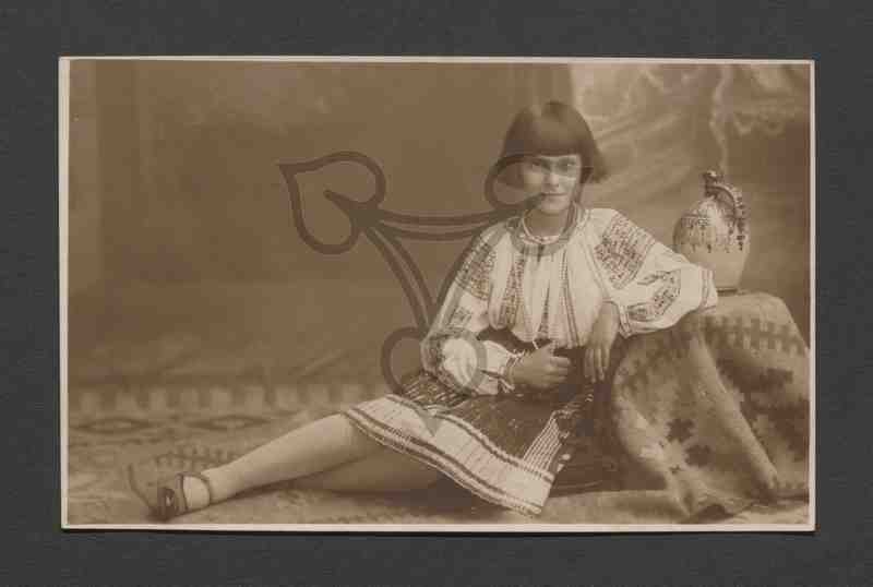 Studioaufnahme, gemalter Hintergrund. Das Tracht tragende Mädchen sitzt auf einer festen dicken Decke, hat die Beine seitlich ausgestreckt und übereinander geschlagen. Der Oberkörper ist aufrecht und wird mit dem linken Arm auf einer nicht näher bestimmbaren Unterlage abgestützt. Das Mädchen blickt in die Kamera. Auf der mit der Decke bedeckten Unterlage steht hinter dem Ellenbogen des Mädchens ein bunt bemalter einhenkeliger Tonkrug.