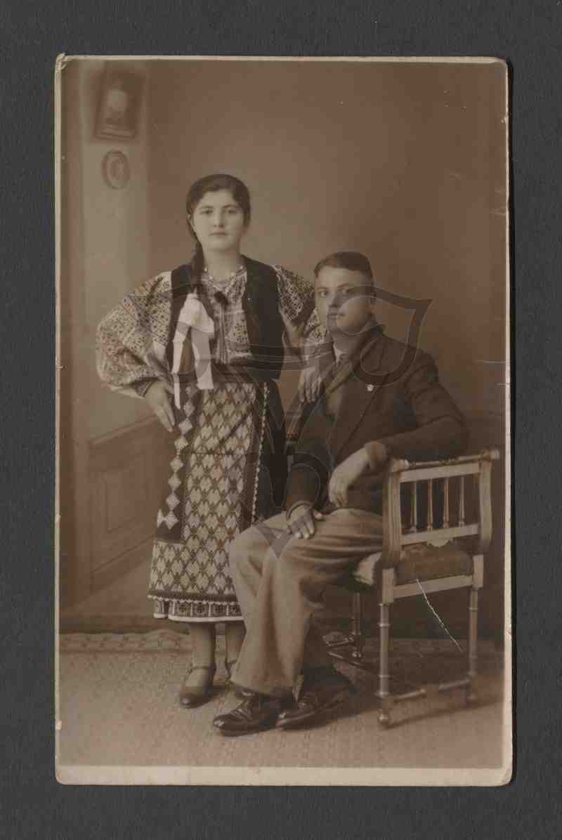 Studioaufnahme, gemalter Hintergrund. Die Frau in Tracht steht aufrecht neben ihrem Mann, der rechts von ihr auf einer Sitzbank sitzt, und legt ihm den linken Unterarm auf seine linke Schulter. Der Mann trägt graue Hosen, eine dunkle Jacke und einen dunklen Schal. Beide blicken in die Kamera.
