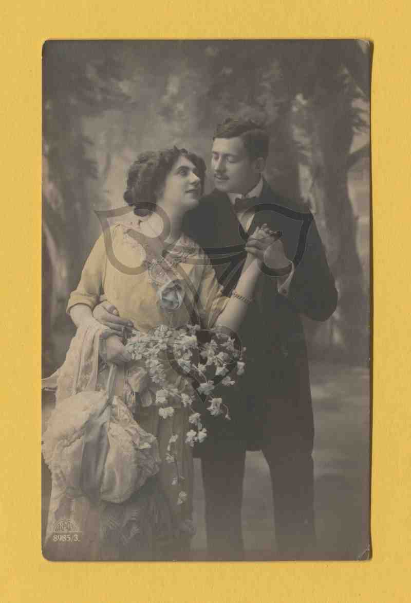 Studioaufnahme, gemalter Hintergrund, teils handkoloriert. Das Paar steht nebeneinander und blickt sich an. Das Kleid der Frau ist hellgelb koloriert mit blassrosa Kragen und hellblauem Saum. Die Stoffbrosche am Dekolleté ist ebenfalls hellblau, das Kopftuch und die Handtasche weiß. Am linken Handgelenk trägt sie ein goldenes Armband. Der Mann ist in einen schwarzen Anzug mit weißem Hemd und schwarzer Fliege gekleidet. Seinen rechten Arm hat er um ihre Hüfte gelegt, mit der linken Hand hält er ihre linke Hand vor seinem Herzen fest. In der linken unteren Ecke Bestellnummer und nicht lesbares Signet des Fotografen.