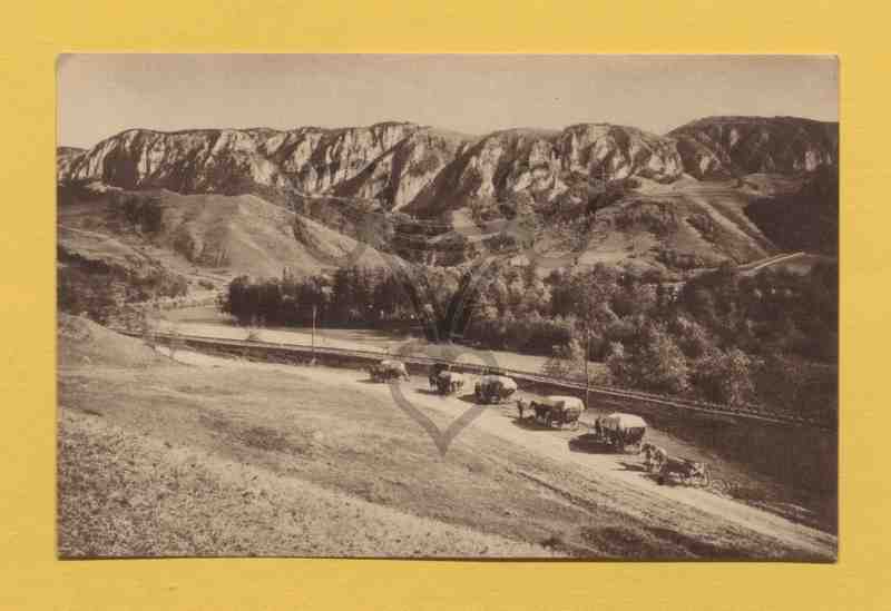 Auf einem unbefestigten Weg entlang einer Bahnstrecke in einem Tal ist eine Kolonne von sechs Leiterwägen zu sehen. Hinter den Bahngleisen eine bewaldete Fläche, dahinter Hügelkette.