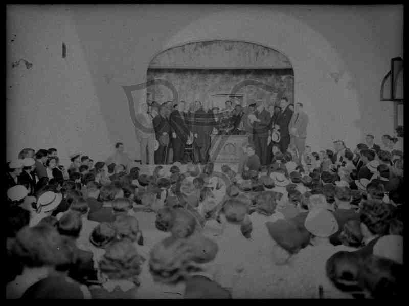 In einem größeren Raum steht Iorga von Männern umringt auf eine Bühne neben einem Rednerpult und spricht zu der sich vor ihm befindenden Menschenmenge.