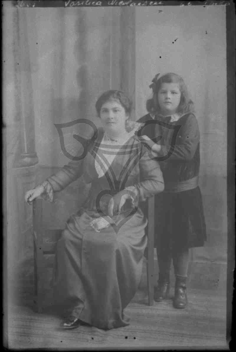 Studioaufnahme, gemalter Hintergrund, Stuhl und Fußbodenbelag Requisite. Auf einem Stuhl sitzt eine Frau. Sie trägt ein dunkles Kleid und eine weiße Bluse. Hinter ihr steht ein Mädchen, ebenfalls in ein dunkles Kleid gekleidet, und hat beide Hände auf die Schultern der Frau (Mutter?) gelegt. Beide sind nach links gewandt und blicken in die Kamera. Am oberen Bildrand sin links und rechts einige Zahlen eingeritzt, in der Mitte der Name. Namenstranskription unsicher.