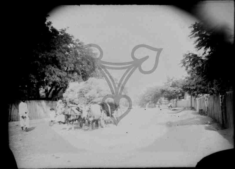 Straßenzeile des Dorfes. Links und rechts des unbefestigten Weges Holzzäune, dahinter Bäume und Gebäude. Bildmittig links ein hoch mit Heu beladener Leiterwagen, der von einem Kuhgespann gezogen wird. Links neben den Kühen eine Tracht tragende Frau und ein Mädchen, am linken Bildrand ein Tracht tragender Mann.