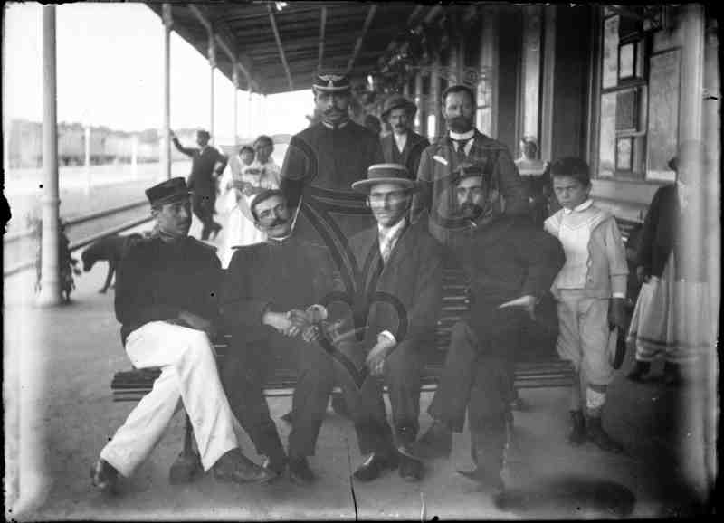 Unter dem Vordach eines Bahnhofgebäudes sitzen vier Männer auf einer Wartebank. Ein Junge steht rechts von dieser. Dahinter sind drei Männer abgebildet, die alle in die Kamera blicken. Im Hintergrund sind weitere Personen erkennbar. Am linken Bildrand verläuft ein Schienenstrang, noch weiter hinten steht ein Zug.