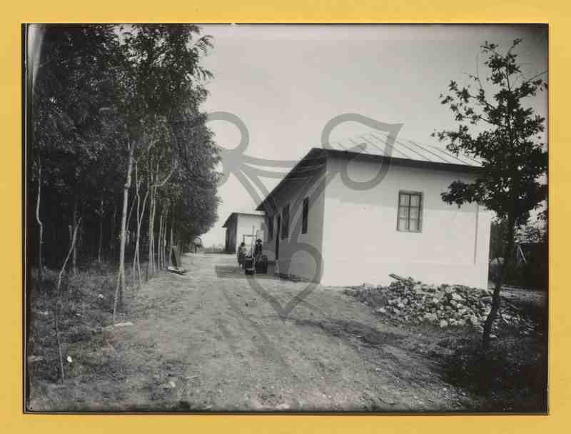 Außenansicht zweiter weiß gestrichener Gebäude. Links von diesen ist ein breiter, unbefestigter Weg zu sehen, am linken Bildrand junge Bäume. Vor dem Eingang des vorderen Hauses steht ein Paar in rumänischer Arbeitstracht. Vor der Frau ein hölzerner Bottich, vor dem Mann ein Holzfass.