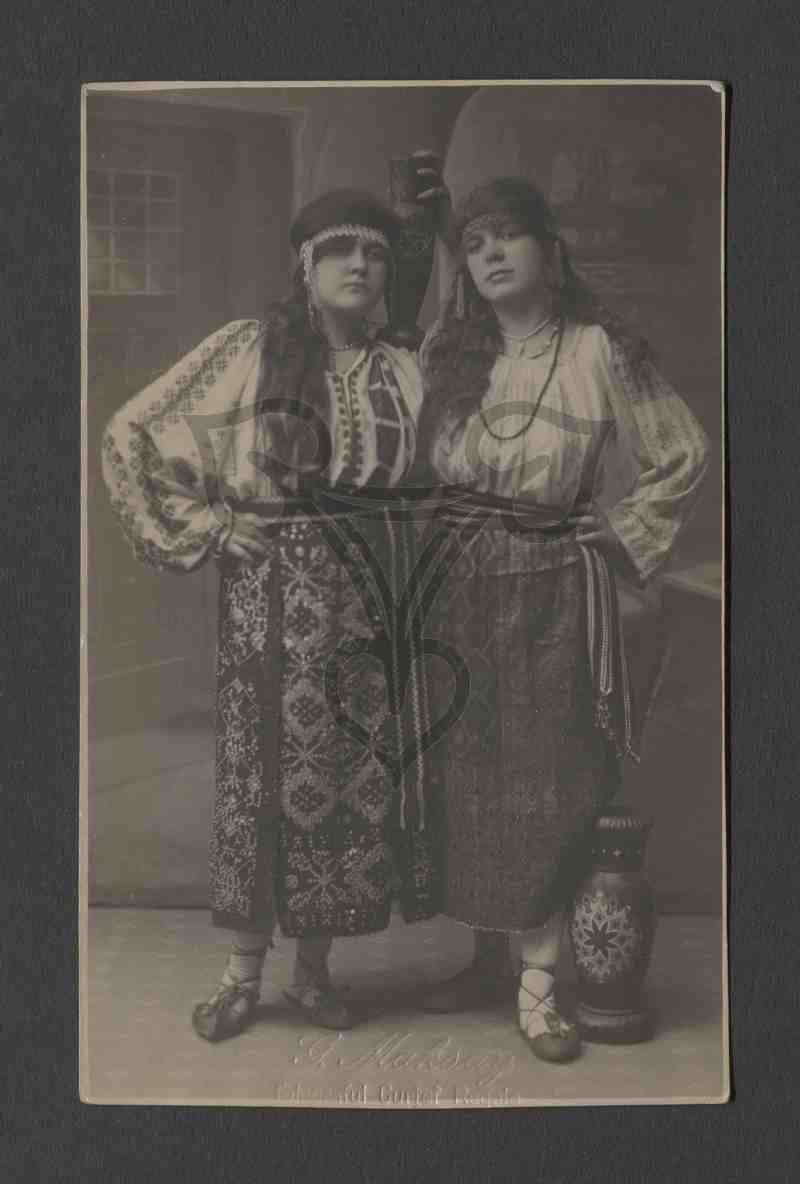Studioaufnahme, gemalter Hintergrund. Die beiden Tracht tragenden jungen Frauen stehen aufrecht nebeneinander und blicken in die Kamera. Die linke hält eine bunt bemalte Tonvase auf ihrer linken Schulter. Eine zweite Vase steht neben dem rechten Fuß der rechten Frau. Am unteren Bildrand mittig der Prägestempel des Fotografen.