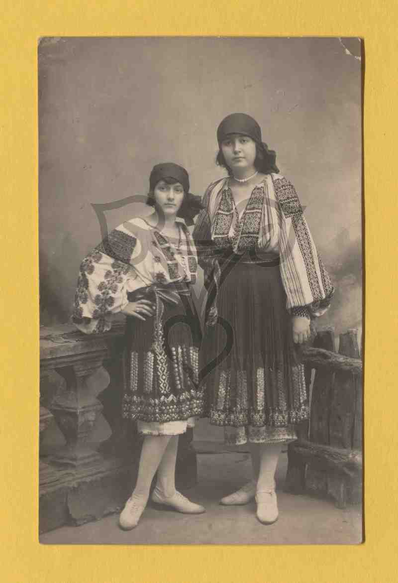 Studioaufnahme, gemalter Hintergrund. Die Tracht tragende Frauen stehen nebeneinander vor der Attrappe eines Terrassengeländers und sind einander zugewandt. Identisch mit PB 207/2601.