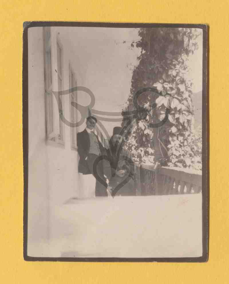Auf einem verschneiten Balkon steht ein an die Hauswand gelehnter Mann in dunklem Anzug neben einem sitzenden Popen. Links die Hauswand, rechts das teils von Efeu bewachsene Balkongeländer.
