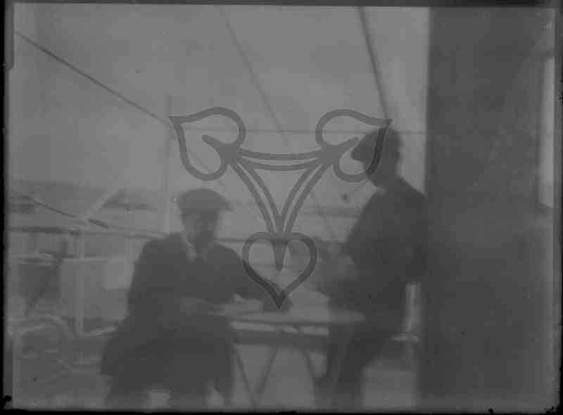 Der linke Mann der Reisegruppe sitzt, vermutlich auf einer Fähre im Bosporus bei Istanbul, an einem Klapptisch und liest Zeitung, der rechte ist an einen Mast gelehnt, hat eine Pfeife im Mund, hält eine Zeitung in den Händen und blickt in die Kamera. Hinter den beiden die Reling des Dampfers, dahinter Wasser, die Silhouette des Küstenstreifens und darüber Himmel.