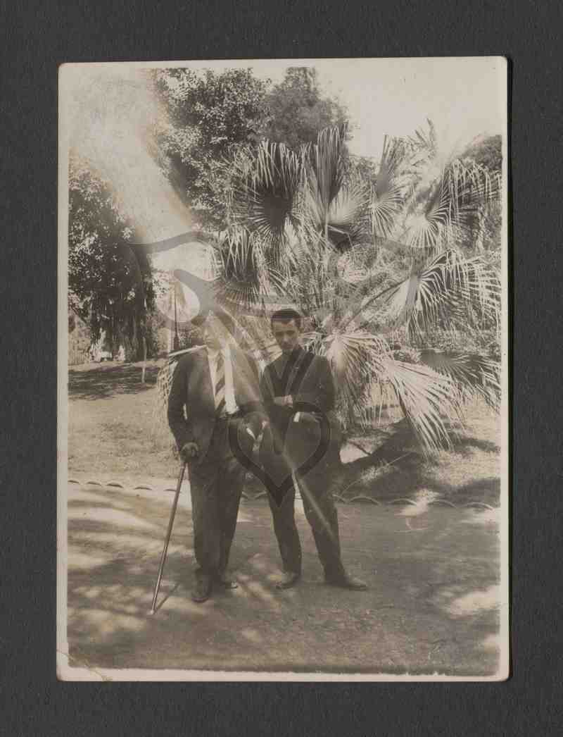 Zwei Männer der Reisegruppe stehen, vermutlich in Istanbul, in einer Parkanlage. Beide sind sie dunkel gekleidet, der linke blickt in die Kamera, der rechte stützt sich lässig auf seinen Spazierstock und blickt nach rechts. Im Hintergrund eine Palme, dahinter Bäume.