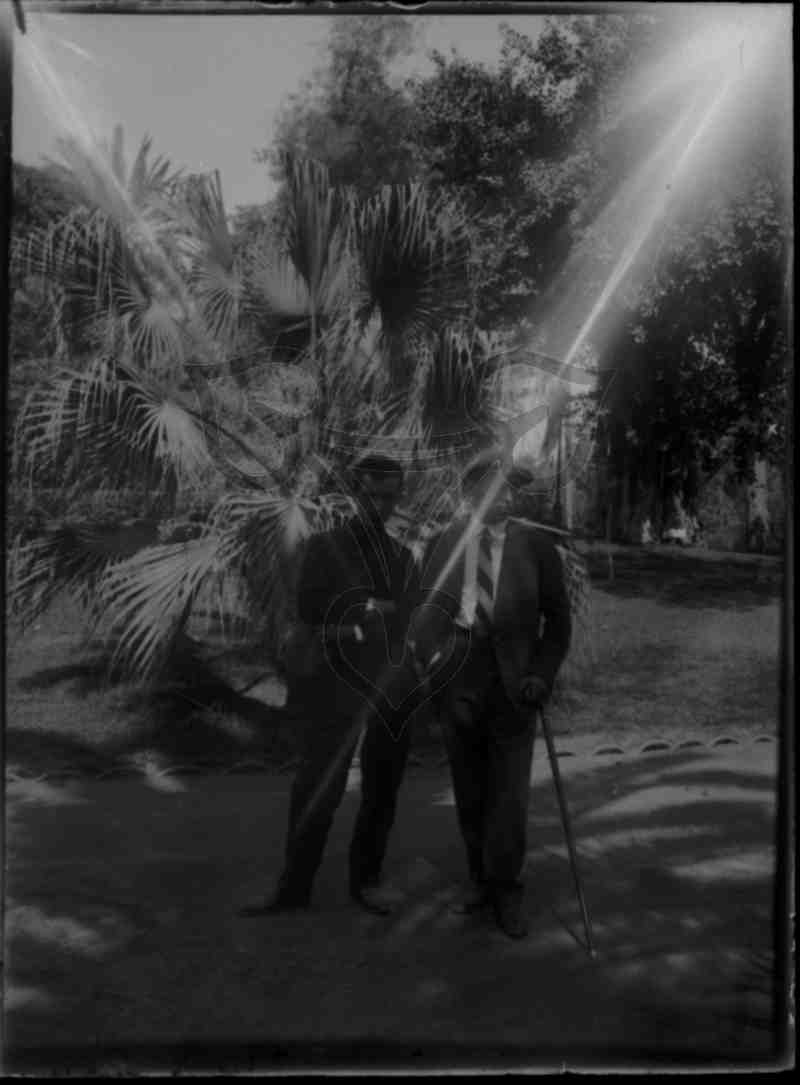 Zwei Männer der Reisegruppe stehen, vermutlich in Istanbul, in einer Parkanlage. Beide sind sie dunkel gekleidet, der linke blickt in die Kamera, der rechte stützt sich lässig auf seinen Spazierstock und blickt nach rechts. Im Hintergrund eine Palme, dahinter Bäume.