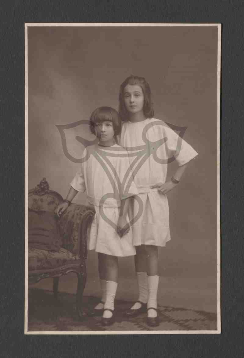 Studioaufnahme, neutraler Hintergrund, Kindersofa Requisite. Die beiden Mädchen tragen weiße Kleidchen, stehen hintereinander schräg nach links gewandt und blicken an der Kamera vorbei. Das vordere kleinere stützt sich mit der rechten Hand auf der Armlehne eines Kindersofas ab.